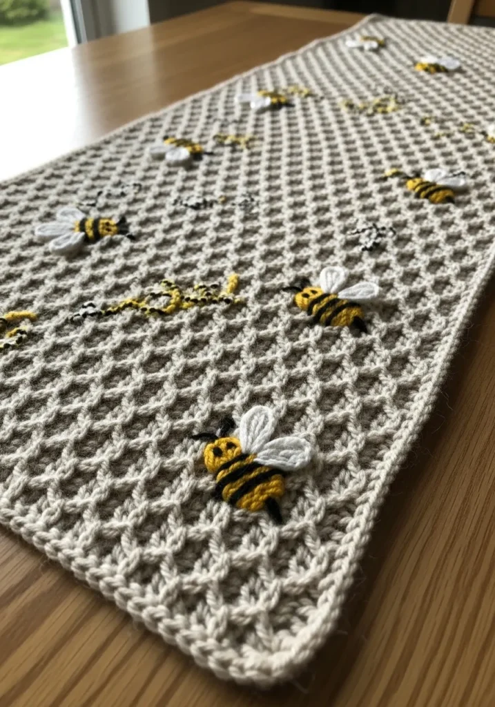 This long table runner features a textured honeycomb stitch pattern in a soft neutral yarn that highlights the repeating geometric design. Tiny embroidered bees in yellow, black, and white add playful dimension, with delicate wings stitched on top of the textured surface. The edges are neatly bordered to keep the piece flat and structured.