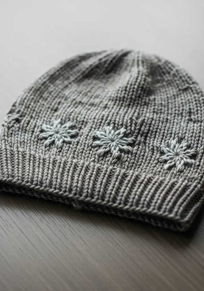 This classic grey beanie is knit in smooth stockinette with delicate embroidered floral bursts scattered around the body. The ribbed brim adds structure and elasticity, creating a comfortable fit that hugs the head without feeling tight. The subtle contrast in the flower stitching gives it a soft decorative touch.