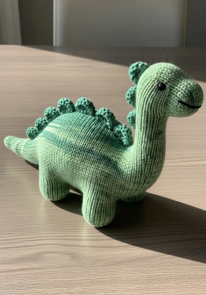 This charming green dinosaur is knit in soft stockinette with gentle color variations that add depth to the body. Small rounded legs, a long curved neck, and textured back spikes create a playful silhouette, while the stitched smile and glossy eyes bring it to life. The seams look smooth and carefully finished, giving it a professional feel.