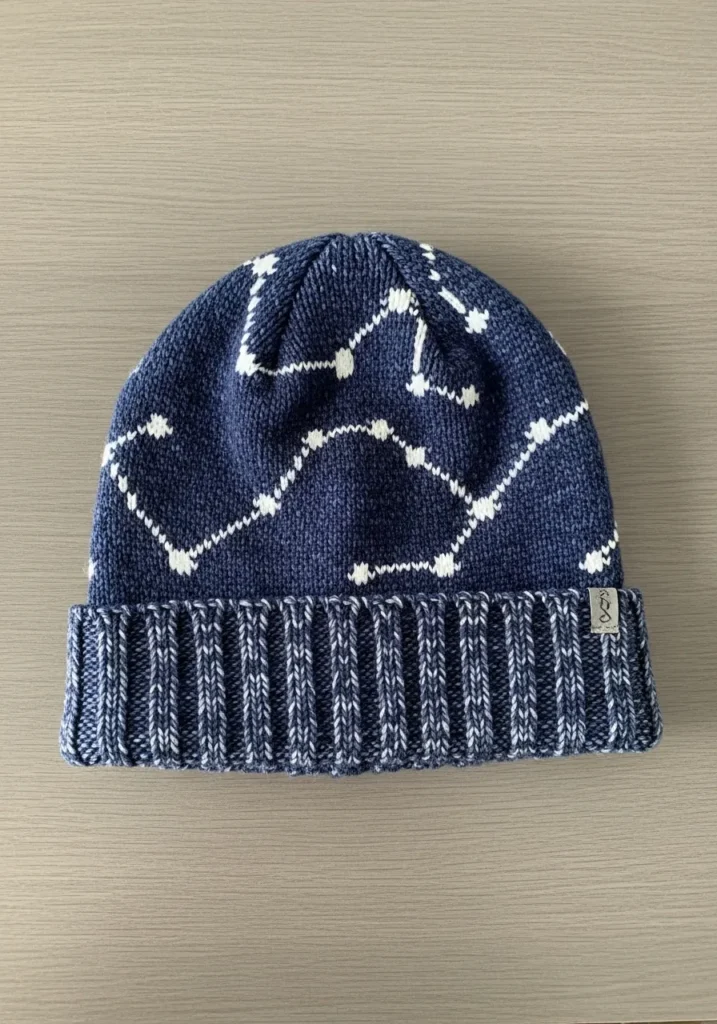This deep navy beanie is knit in smooth stockinette with crisp white constellation motifs scattered across the crown like a tiny night sky. The wide ribbed brim adds beautiful vertical texture and extra stretch, blending two shades of blue for subtle depth and dimension. The fabric looks soft yet structured, with clean colorwork lines that give it a polished finish while still feeling cozy and wearable.