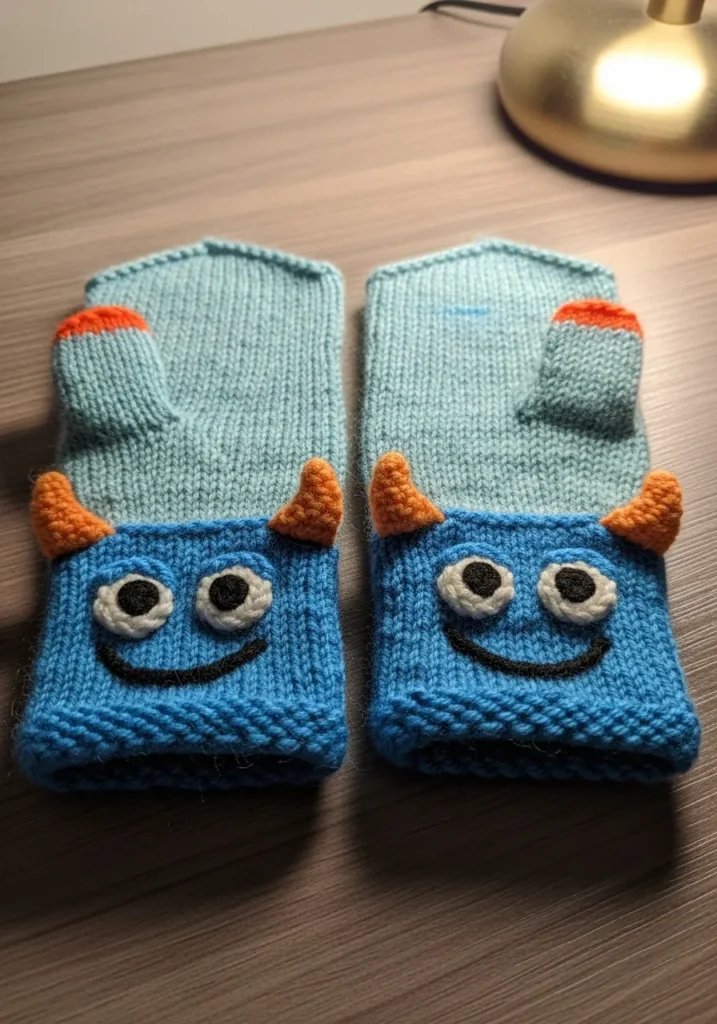 These playful mittens combine soft aqua cuffs with bright blue hands and cheerful monster faces stitched on the front. Little knitted horns in warm orange sit at the top, and the big round eyes and curved smiles add a fun cartoon vibe. The ribbed cuffs look snug and stretchy, while the body appears smoothly knit with clean decreases that shape the top neatly.