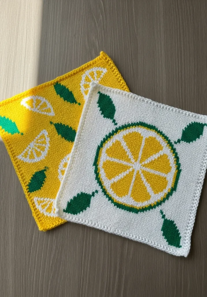These square knitted cloths feature bold lemon slice motifs in cheerful yellow, crisp white, and leafy green. One version has a sunny yellow background with repeating lemon wedges, while the other highlights a large centered lemon on a white base. The edges are neatly framed with tidy borders that help the squares stay flat and structured.