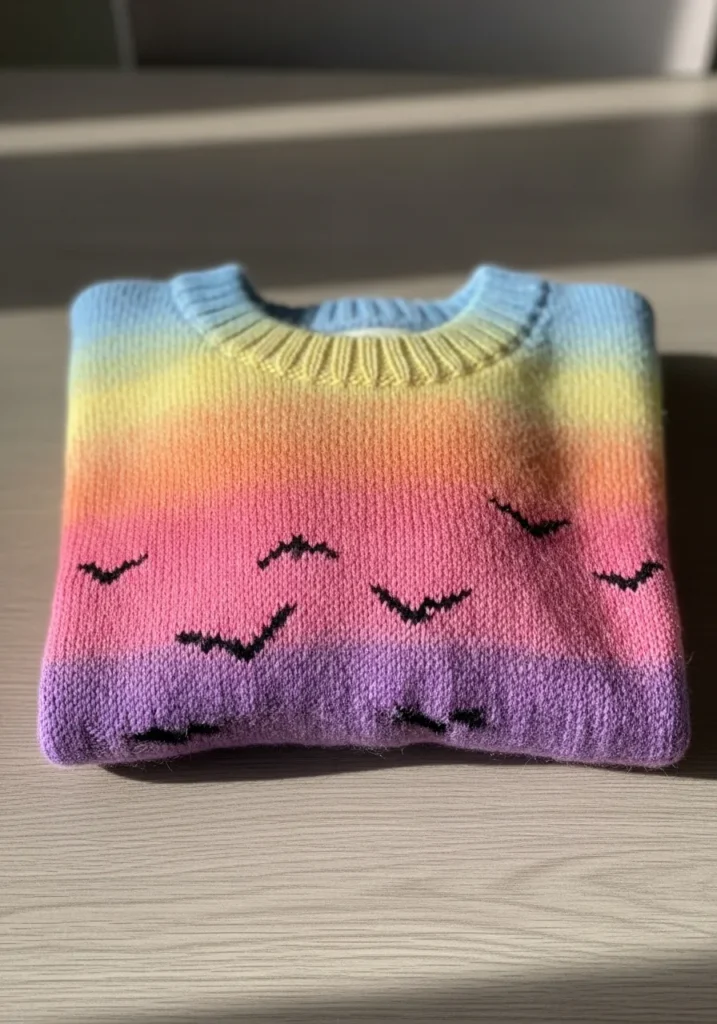 This cozy sweater blends pastel shades from sky blue to buttery yellow, soft pink, and gentle lavender in smooth horizontal stripes. Tiny black bird silhouettes are stitched across the front, adding a delicate contrast against the dreamy gradient background. The ribbed neckline looks structured and snug, balancing the airy softness of the color transitions.