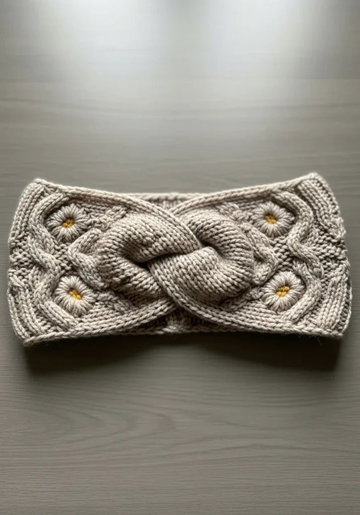 This neutral toned headband features a bold central cable twist that creates beautiful movement across the fabric. Surrounding the cable are delicate floral motifs with soft yellow centers, adding subtle pops of color against the creamy yarn. The overall texture looks rich and dimensional, likely knit with a warm wool that highlights every stitch.