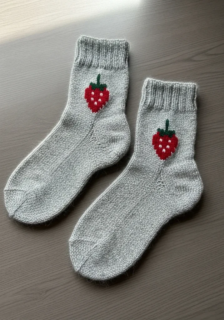 These light grey socks are knit in a fine, even stockinette with a sweet red strawberry motif placed neatly above the ankle. The ribbed cuffs look stretchy and snug, and the heel shaping appears smooth and well defined for a comfortable fit. The simple color palette keeps the design fresh while letting the tiny fruit detail pop.
