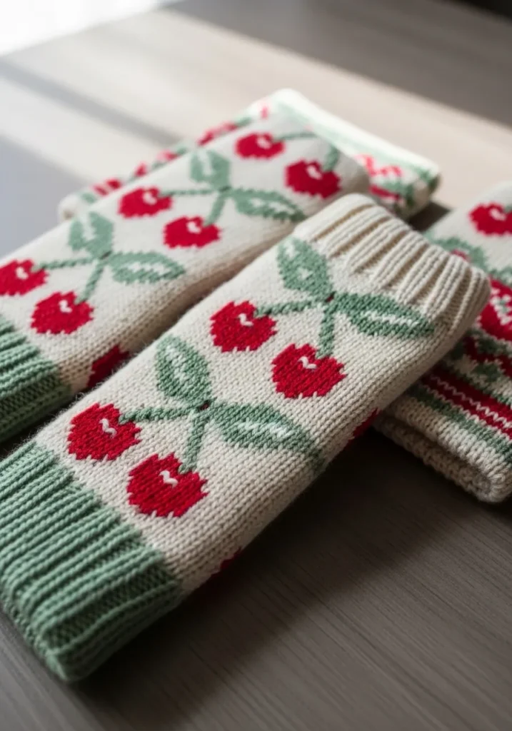 I think arm warmers are such an underrated project. They are small enough to finish without feeling overwhelmed, yet the repeating cherry pattern makes them look beautifully detailed. I would happily wear these on a chilly morning just to show off those tiny pops of red.