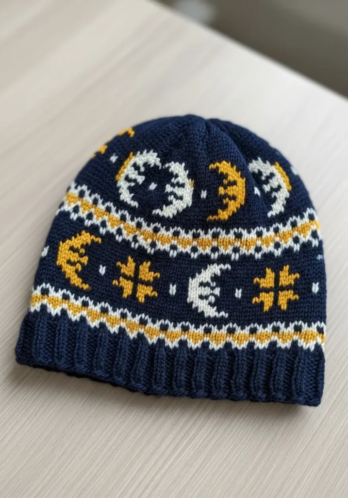 This cozy Fair Isle beanie is knit in a deep navy blue yarn with crisp white and warm golden yellow motifs circling the crown. The pattern features tiny crescent moons, stars, and geometric accents that pop beautifully against the dark background. The ribbed brim adds stretch and structure, while the smooth stockinette body keeps the colorwork looking clean and bold. The overall design feels wintery and a little bit magical, like a clear night sky wrapped around your head.