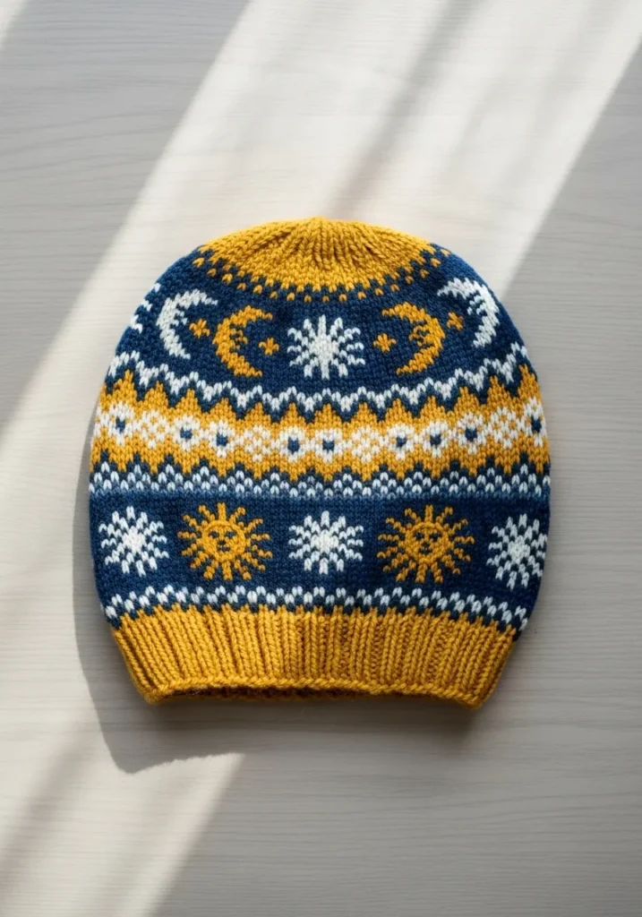 I love how a hat like this instantly makes a simple outfit feel special. The repeating moon and star pattern looks intricate but it is totally doable with a basic Fair Isle chart and a little patience. This is the kind of project I would knit while watching my favorite series, because once the rhythm clicks, it becomes so relaxing and satisfying.