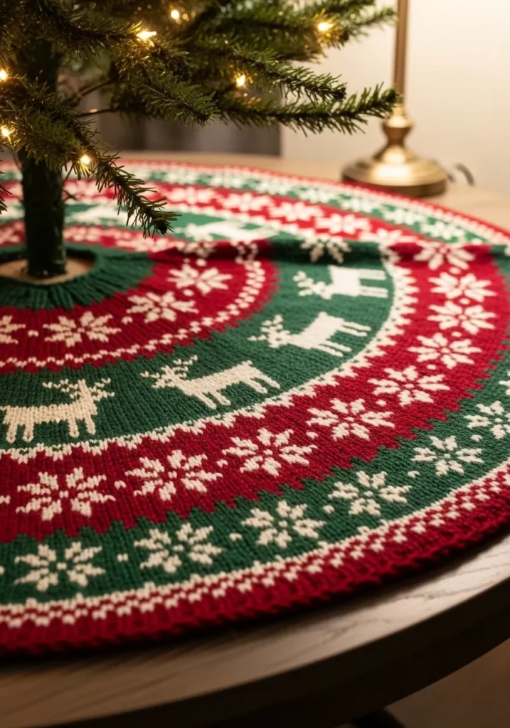 This circular Fair Isle tree skirt is knit in rich holiday shades of deep red, forest green, and crisp white, with bands of snowflakes and graceful reindeer marching around the design. The colorwork flows beautifully in concentric rings, creating a balanced and eye catching pattern that frames the base of the tree perfectly. The knitted fabric looks dense and cozy, with neat stitches that make every motif stand out clearly against the bold background.