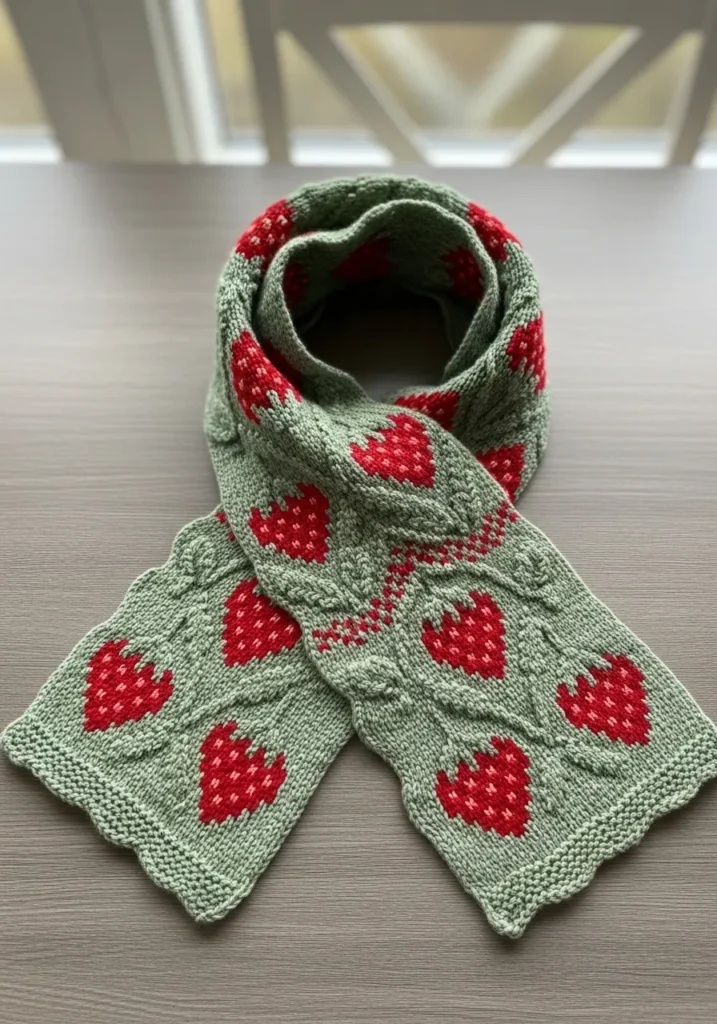 This charming scarf is knit in a soft sage green base with bright red strawberries and tiny white flower details scattered throughout. The ends are shaped into neat triangular points, which gives it a playful twist compared to a classic straight scarf. The yarn looks plush and slightly textured, making the colorwork feel cozy rather than stiff. The contrast between the fresh green and juicy red gives it a cheerful handmade vibe.