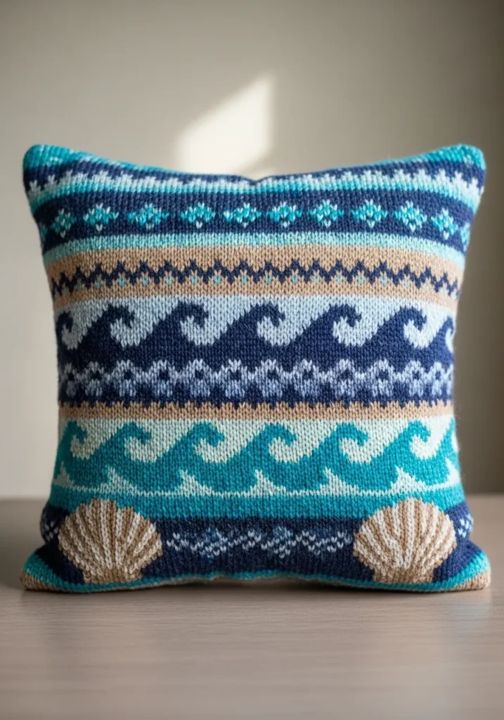This stunning cushion cover features layered bands of blue, aqua, and white with wave inspired motifs and delicate shell accents along the bottom. The square shape keeps it modern, while the intricate horizontal pattern bands give it that signature Fair Isle charm. The mix of cool tones creates a calm coastal look, and the texture of the knit fabric adds depth and warmth to the design.