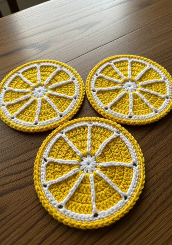 These round knit coasters are designed to look just like fresh lemon slices, complete with bright yellow outer edges and detailed white segment lines radiating from the center. The texture is slightly raised where the segments meet, giving the pieces a dimensional and realistic look. Set against a wooden table, the vibrant yellow yarn really pops and brings a fresh, zesty vibe to the space.