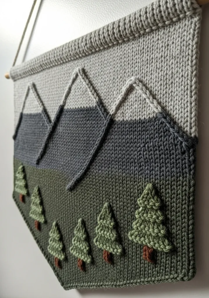 This knitted wall hanging features a calming landscape scene with layered gray mountains and small textured green pine trees along the bottom. The top is attached to a simple wooden dowel, giving it that modern handmade decor feel. The color palette stays neutral with soft grays and muted greens, which makes the piece feel cozy and grounded.