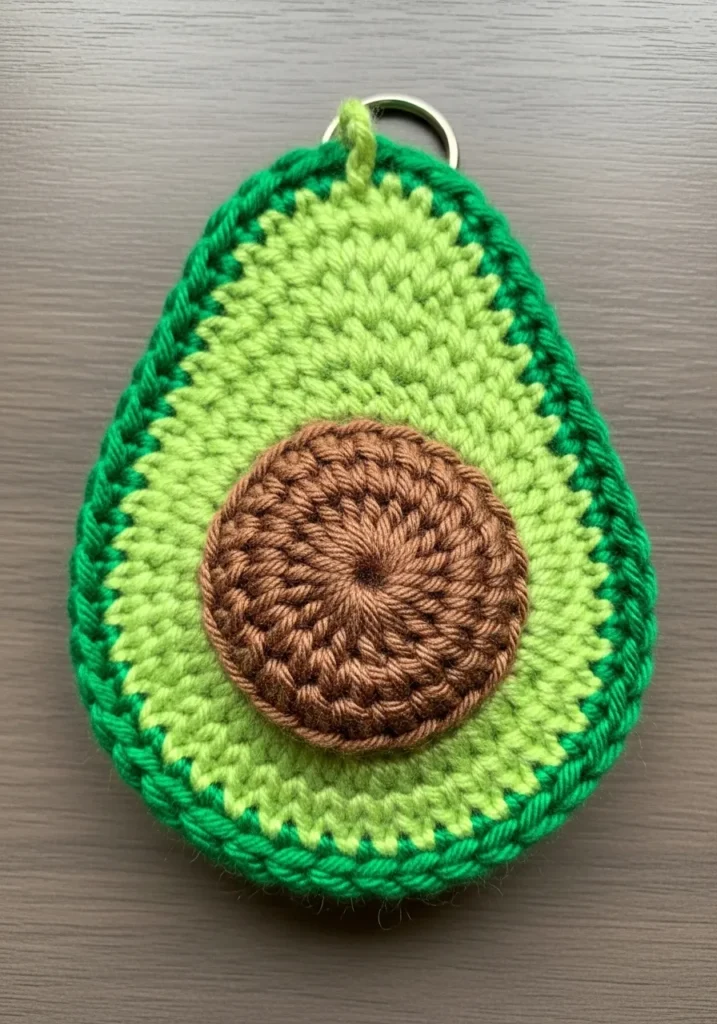 This adorable avocado shaped knit keychain features layered greens for the outer flesh and a rich brown circle for the pit, all worked in tight stitches that give it a sturdy shape. The simple rounded silhouette and small metal keyring at the top make it both decorative and functional. The color contrast between the bright green and darker center really makes the design pop.