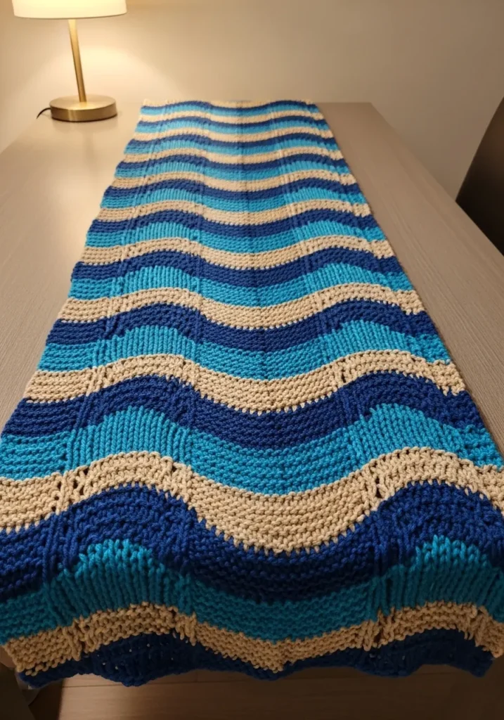 This knitted blanket showcases flowing wave stripes in shades of blue, teal, and sandy beige, creating a soothing ocean inspired pattern. The stripes ripple gently across the fabric, adding movement and visual interest while keeping the overall design harmonious. The yarn looks soft and cozy, perfect for draping over a bed or curling up with on the couch.