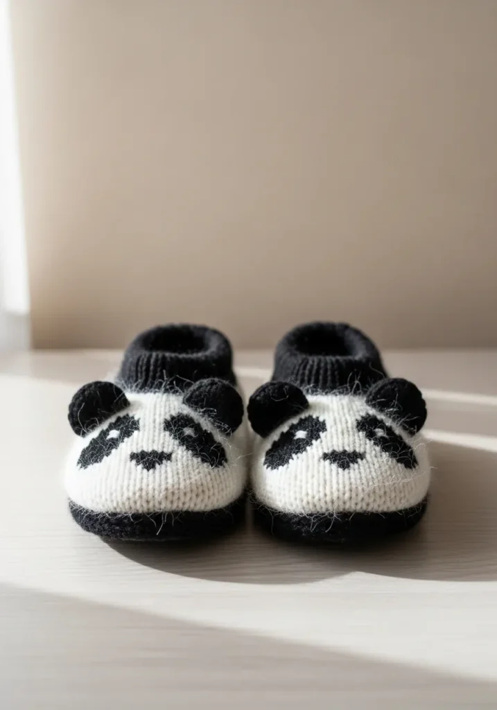 These tiny knit baby booties are designed to look like sweet little panda faces, with black ears and eye patches set against a soft white base. The texture appears plush and gentle, perfect for delicate baby skin. The rounded shape and snug cuff make them both practical and irresistibly cute.