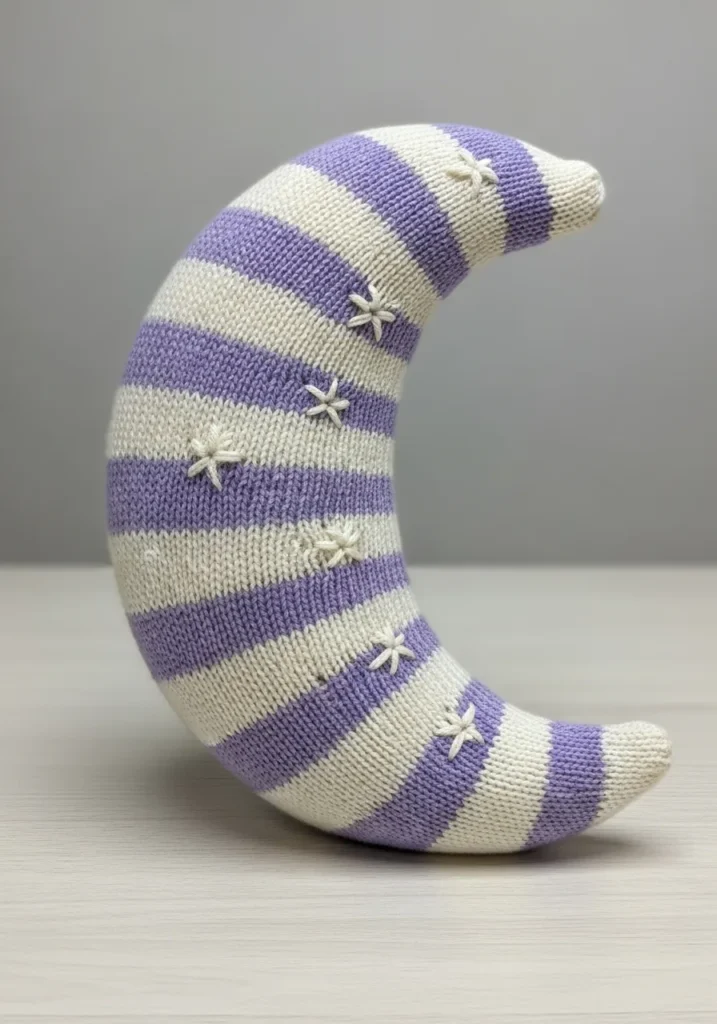 This crescent moon pillow is knitted in soft lavender and white stripes, with subtle star accents stitched across the surface. The curved shape is neatly stuffed to hold its form, creating a dreamy decorative piece that would look adorable in a nursery or cozy reading nook. The alternating stripes give it a gentle, whimsical feel without being overpowering.