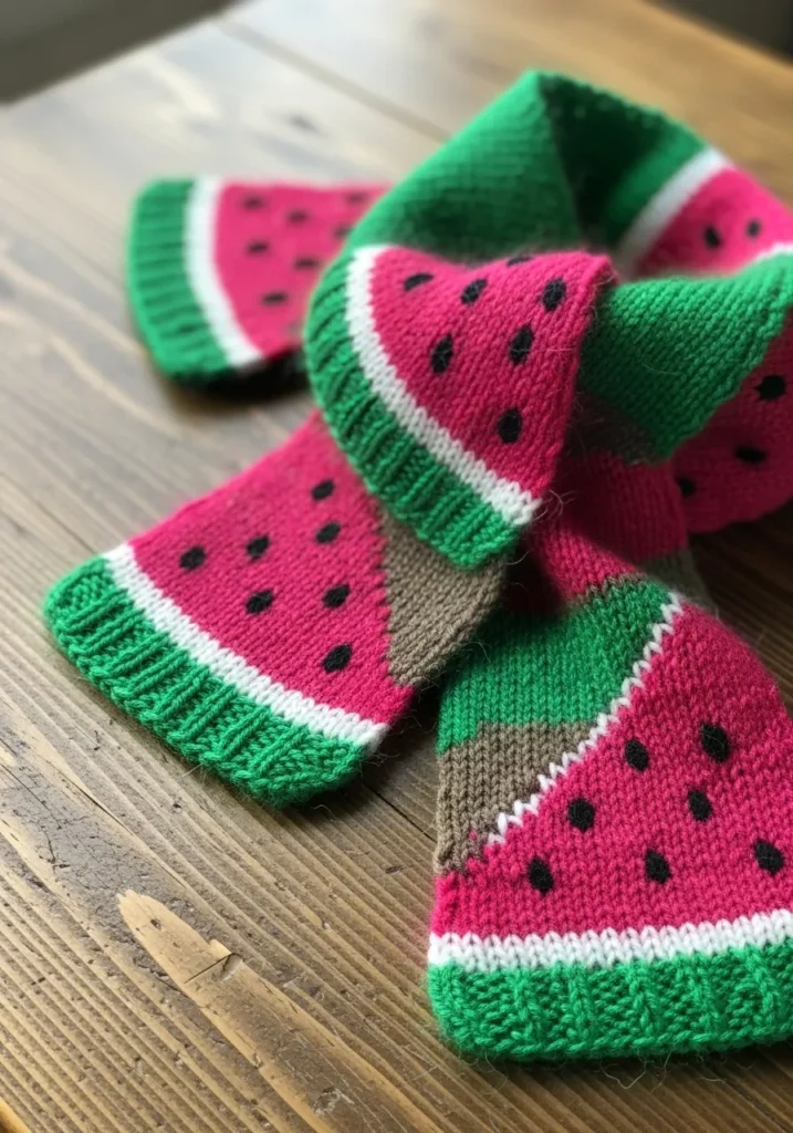 This playful scarf is designed to look like juicy watermelon slices, with bright pink centers, tiny black seed stitches, and bold green borders edged in white. The triangular shapes are knit in soft yarn that drapes nicely while still holding their fun fruit inspired structure. The color contrast is vibrant and cheerful, instantly catching the eye.