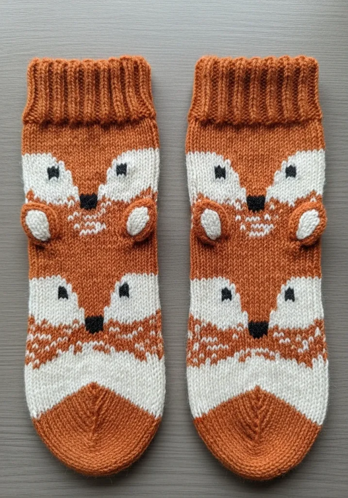 These charming knit socks feature a warm rust orange base with playful fox faces stitched right into the fabric. The ribbed cuffs in a deeper brown shade keep them snug, while white and black details create the sweet little eyes, ears, and nose. The overall texture looks soft and cushy, with a classic sock shape that feels both practical and adorable at the same time.