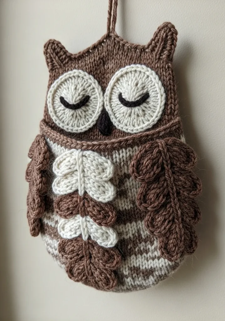This adorable owl wall hanging is crafted in warm brown yarn with layered textures that create feathers and wings. The large closed eyes and soft white accents on the chest give it a gentle, sleepy expression. The shape is slightly rounded and stuffed just enough to hold its form, making it feel plush and inviting.