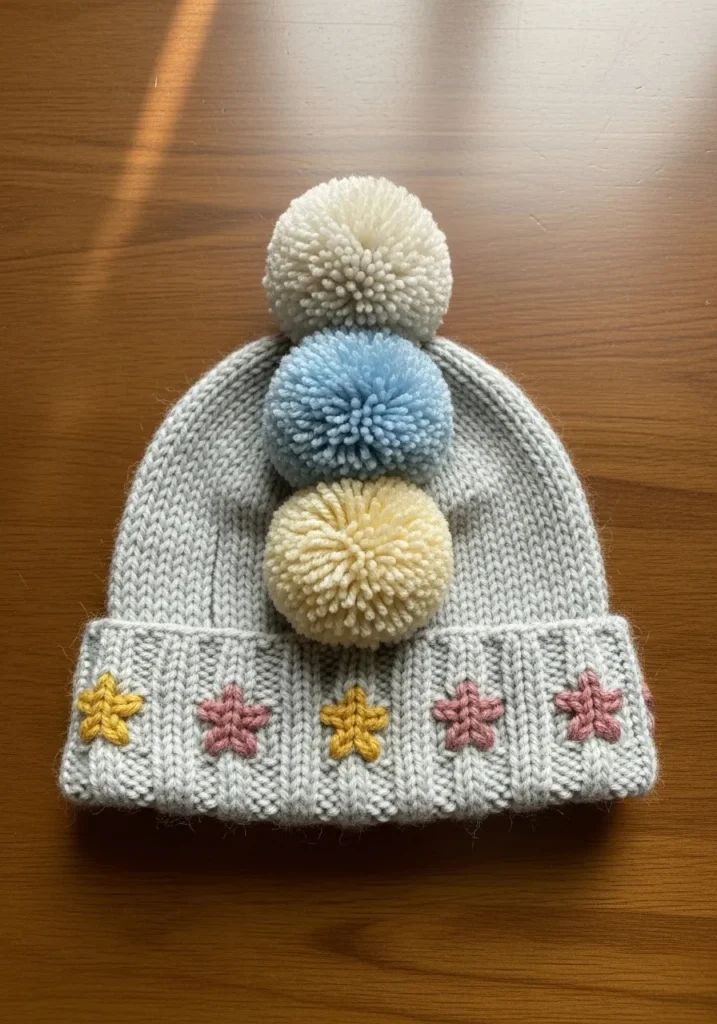This cozy knit beanie is worked in a soft cream yarn and topped with three fluffy pom poms stacked in neutral shades of beige, gray, and pale yellow. Around the brim, tiny embroidered flowers in soft pink and yellow add a delicate pop of color. The ribbed edge gives it structure, while the smooth body keeps the look clean and modern.