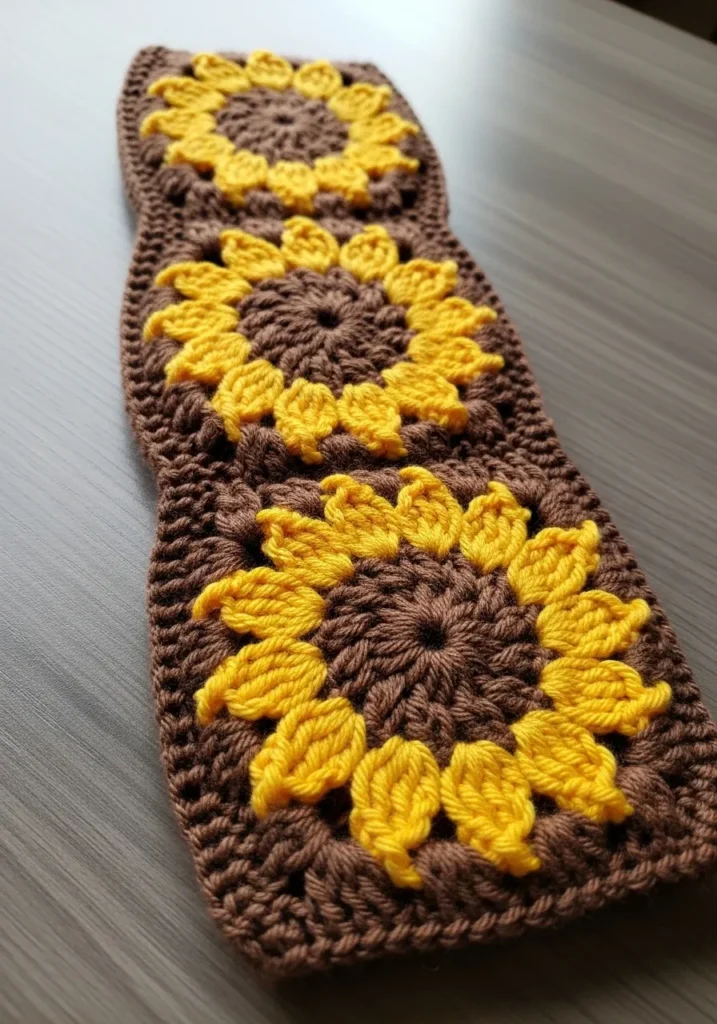 This vibrant panel showcases large sunflower motifs with rich brown centers and bright yellow petals framed by earthy tones. The texture looks slightly raised where the petals pop against the background, creating beautiful dimension. The long rectangular shape makes it perfect for a scarf, table runner, or statement accessory.