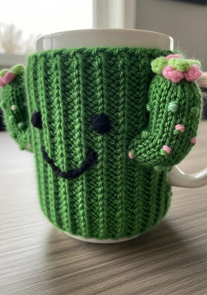 This adorable mug cozy is knit in a bright cactus green yarn with vertical ribbing that mimics the look of a real cactus. Tiny pink flowers add a sweet touch on top, and a stitched smiley face gives it tons of personality. The snug wrap design fits neatly around a mug, making it both decorative and functional.
