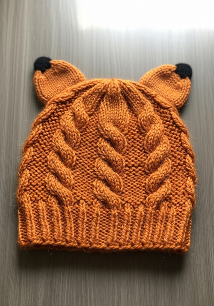This adorable beanie is knitted in a rich burnt orange yarn that gives it that perfect cozy autumn vibe. The body of the hat features bold diagonal cable twist patterns that run up from the ribbed brim and converge toward the crown, creating a really eye-catching texture with serious depth and dimension. The ribbed brim adds a classic structured touch, while the two little fox ears at the top are the real showstopper — each one tipped in a small bit of dark navy yarn to mimic the look of a real fox. It’s playful, warm and genuinely well-crafted.