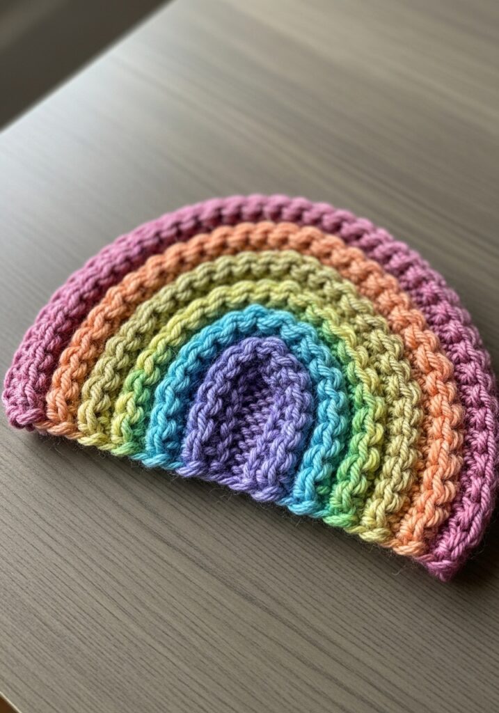 This little rainbow pouch is so cheerful it honestly makes me smile every time I look at it. Knitted in the most dreamy pastel rainbow color sequence, it starts with soft purple at the innermost arch and works outward through sky blue, mint green, yellow-green, peach, soft orange and finally a pretty pink on the outermost band. Each color forms its own beautifully defined ribbed arc that radiates outward from the center, creating that satisfying concentric rainbow shape that looks almost like a little yarn sculpture sitting on the table. The ribbing runs horizontally around each arch which gives the whole piece a wonderfully plump, rounded texture, and the chunky yarn weight makes every color band really bold and well-defined. The result is genuinely just a little bundle of joy in knitted form.