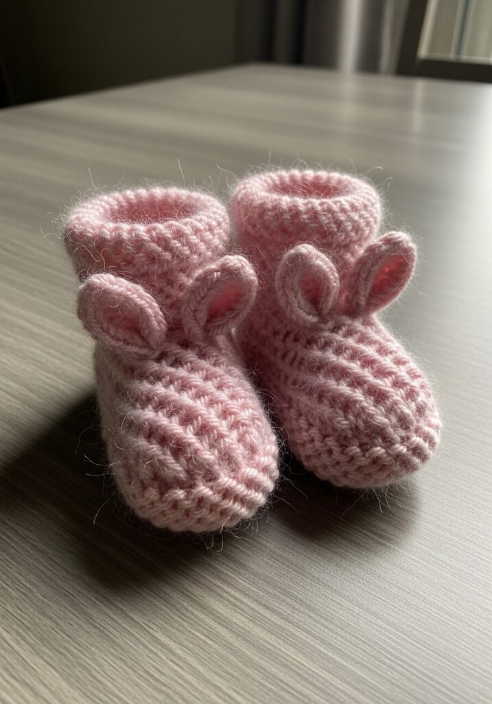 These tiny baby booties are so sweet they should honestly come with a warning because the cuteness level is completely out of control. Knitted in the softest baby pink yarn with a lovely slightly fluffy halo that makes them look extra cozy and cloud-like, the booties feature a beautifully textured body worked in a diagonal rib or twisted stitch pattern that wraps around the foot and gives the whole bootie a really lovely structured look. A neat rolled cuff sits at the ankle, and then right at the back of each bootie sit two perfect little bunny ears that are just the most precious finishing detail imaginable, each one shaped and slightly pinched to look like a real rabbit ear with a tiny blush pink inner ear peeking through. The whole design is incredibly cohesive and delicate, and that soft pink colorway makes them feel like a proper heirloom-quality handmade gift.