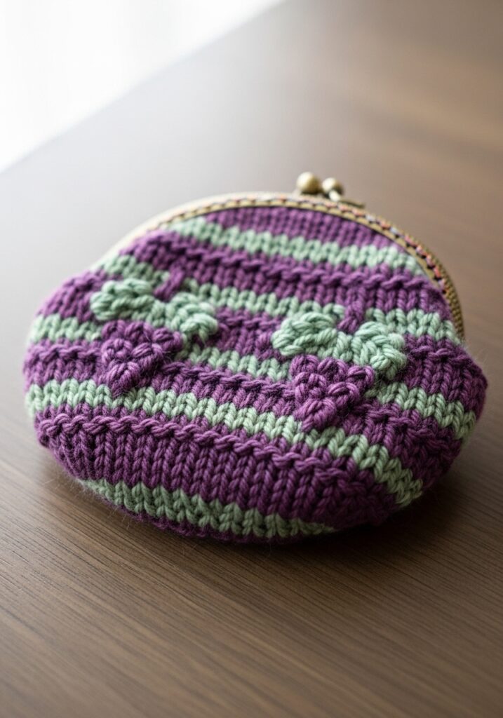 Two-color knitting with built-in texture details is one of those techniques that sounds fancy but is actually so rewarding to practice on a small project like this. The purse shape is compact enough that even if you are still getting the hang of carrying two yarns at once, you are not committing to a massive time investment while you figure it out. I love that the stripe sequence breaks up the color work into really manageable sections too, so it never feels overwhelming. The color combination here is just so unexpected and sophisticated that it looks way more intentional and designer-y than a simple striped purse has any right to look, and that is honestly my favorite kind of crafting win.