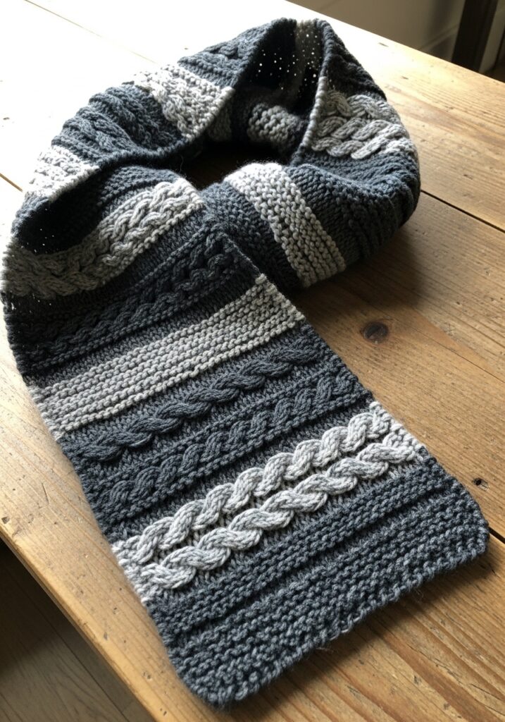 This cowl is the kind of piece that looks like it took serious skill to make and yet I genuinely think it is more achievable than it appears, which is exactly the kind of project I love to talk about. Worked in two complementary shades of grey, a deep slate blue-grey and a lighter silver grey, the design features alternating horizontal bands of each color that create a really striking tonal stripe effect across the whole width of the cowl. Within those bands sit beautifully defined braided cable sections that switch between the two colors as the stripes progress, so at some points you have light grey cables against a dark background and at others the dark cables pop against the lighter sections. The result is this wonderfully complex-looking layered texture that catches the light in the most satisfying way, and the whole piece has a really modern, architectural quality that feels elevated and polished rather than just cozy and casual.
