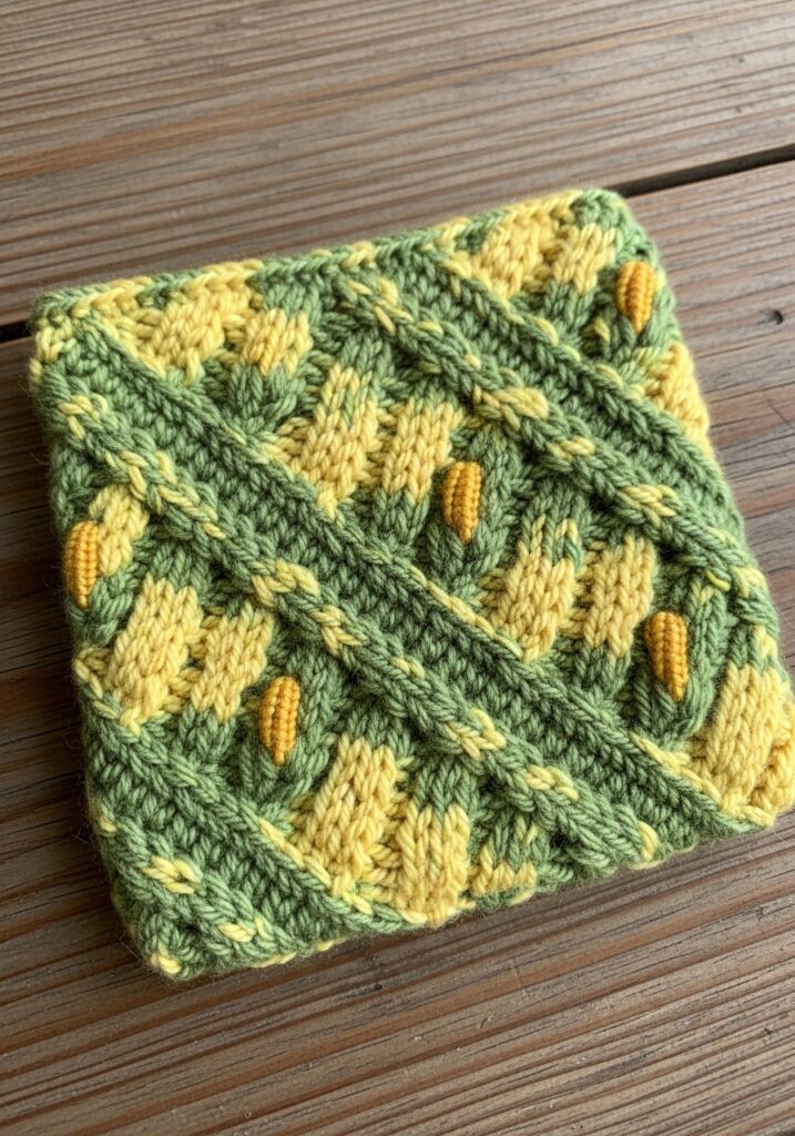 This cowl is genuinely one of the most visually striking knitted pieces I have come across in a long time and I cannot stop looking at it. Worked in a bold two-color combination of soft sage green and bright chartreuse yellow, the design features dramatic diagonal cables that sweep across the surface at an angle, creating this really dynamic flowing movement that makes the whole piece feel almost like it is in motion. The two colors interweave through the cable pattern in a way that makes each twisted rope section shift between green and yellow depending on which strand is crossing over, giving the texture an almost kaleidoscopic quality. Scattered throughout the yellow sections between the cables are tiny raised orange-gold bobble details that sit like little seeds or buds nestled into the fabric, adding a third color accent that ties the whole earthy botanical palette together beautifully. The overall effect is incredibly rich and complex-looking and honestly resembles something you would find in a high-end yarn boutique.