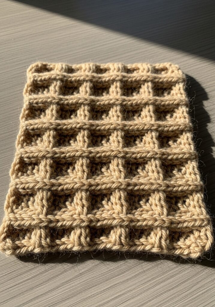 This cowl is giving the most incredible texture study and I genuinely could stare at it all day long in the best possible way. Knitted in a warm, toasty camel brown yarn that looks incredibly natural and earthy, the entire piece is worked in a deeply structured waffle stitch pattern that creates a pronounced grid of raised squares across the surface with neat horizontal ridge lines running between each row of squares. The sunlight in the photo really shows off just how three-dimensional this texture is, with each little square section casting its own tiny shadow and giving the whole fabric this wonderfully architectural, almost sculptural quality. The color is just perfect for the stitch too because that warm neutral tone lets every ridge and recess in the waffle pattern show up with maximum clarity, and the overall result is something that feels both rustic and really refined at the same time.