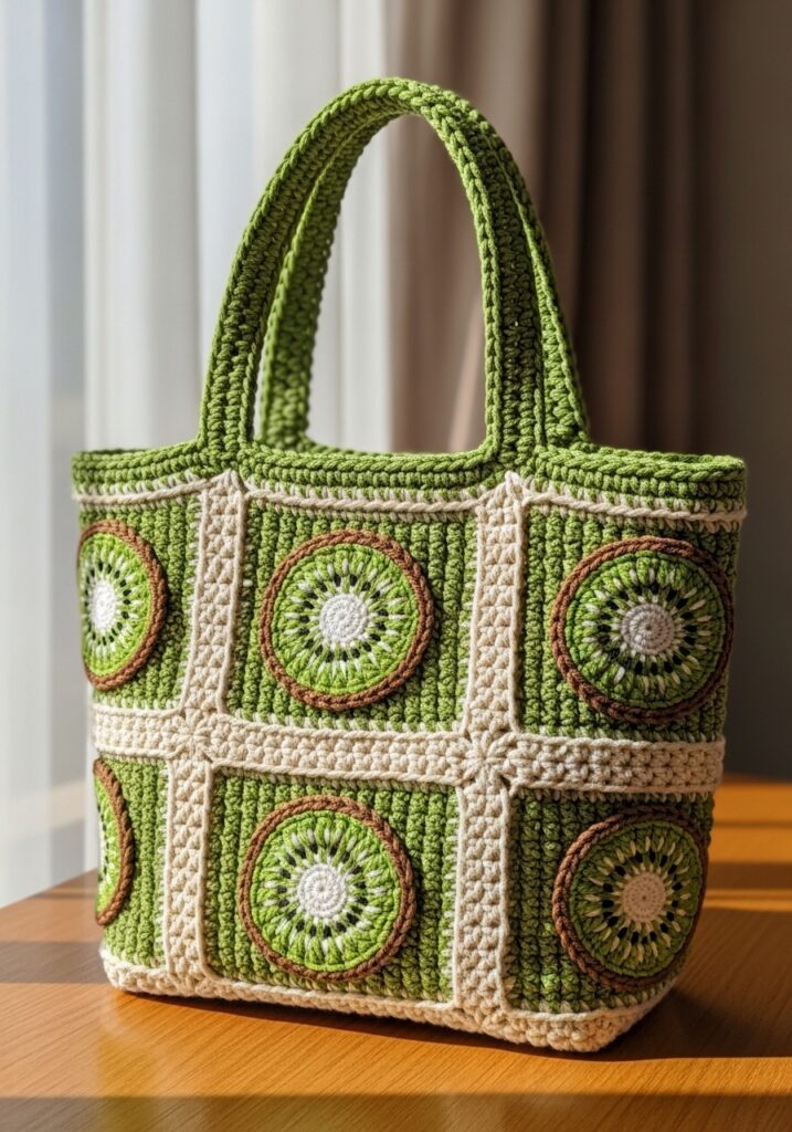 This tote bag is an absolute showstopper and I genuinely think it might be one of the most creative fruit-themed crochet bags I have ever come across. The body is constructed in a grid of square panels worked in fresh grass green and clean cream cotton yarn, with neat cream borders separating each section to give it a really structured, patchwork-inspired look. Each green panel features a large and incredibly detailed kiwi slice motif worked in the round, complete with a tiny white center, radiating green flesh sections, tiny dark seed details and a warm brown outer ring that mimics the fuzzy skin of a real kiwi fruit so convincingly it is almost too good. The chunky green handles are sturdy and well-proportioned to the bag size, and the whole piece has a really polished, structured shape that sits upright beautifully and looks like it means business as an actual functional bag.