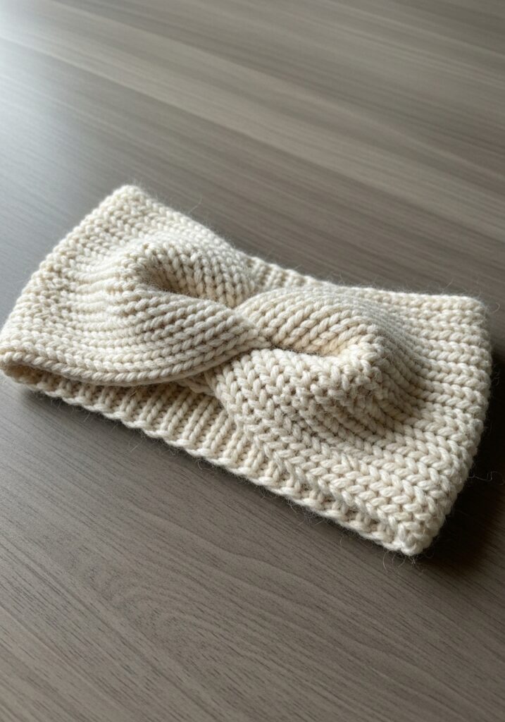 This gorgeous ear warmer is knitted in a soft, creamy off-white yarn that looks incredibly luxurious and cozy. The body features a lovely herringbone-style textured stitch that adds beautiful subtle depth across the band, paired with a neat ribbed edge along both the top and bottom for a clean, polished finish. The real magic is that twisted knot detail right in the center, where the fabric crosses over itself to create that chic knotted look that makes it appear way more complicated than it actually is. The whole thing has a minimalist, Scandinavian-inspired aesthetic that honestly looks like something you’d find in a boutique for a lot more money than it costs to make.