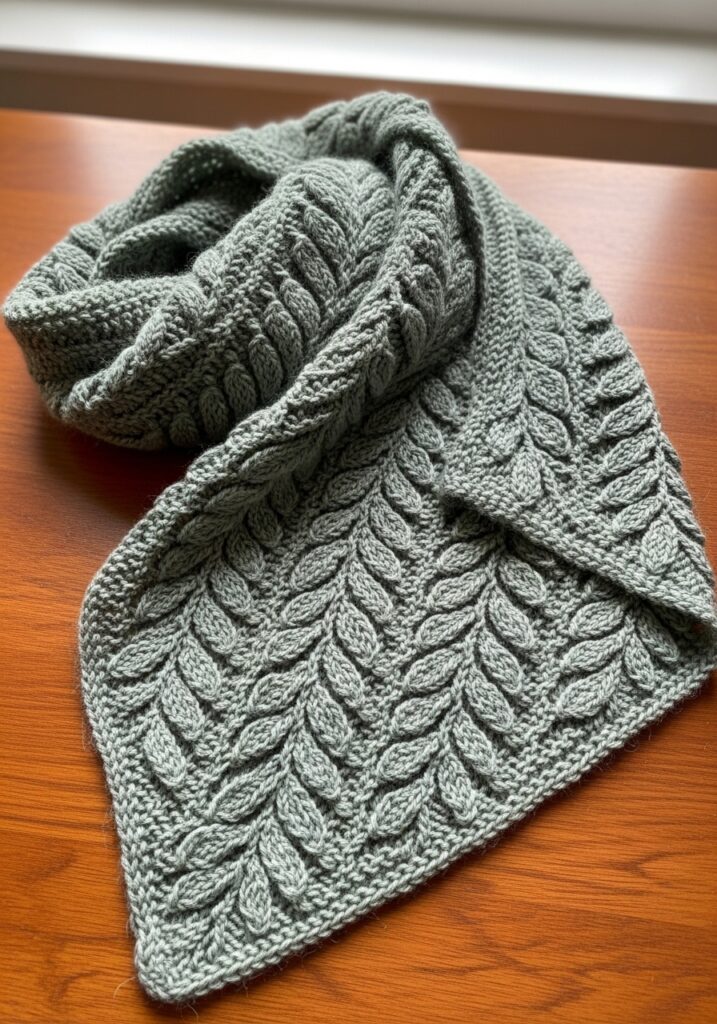 This cowl is so breathtakingly pretty that it genuinely stopped me in my tracks the moment I saw it. Knitted in a soft, muted sage green yarn with a really lovely smooth finish that shows off every stitch detail perfectly, the entire surface is covered in a flowing leaf lace pattern that creates rows of delicate raised oval leaf shapes arranged in gently curving columns across the fabric. The leaves are formed through a combination of increases and decreases that give each one a really beautiful pointed tip and a soft rounded base, and they sit against a background of fine twisted rib columns that frame each leaf section and add even more vertical texture to the mix. The way the whole pattern sweeps and curves as the cowl drapes gives it this wonderfully organic, botanical quality that feels genuinely elegant, and the sage green colorway could not be more perfect for letting all that intricate stitch detail shine without any distraction.