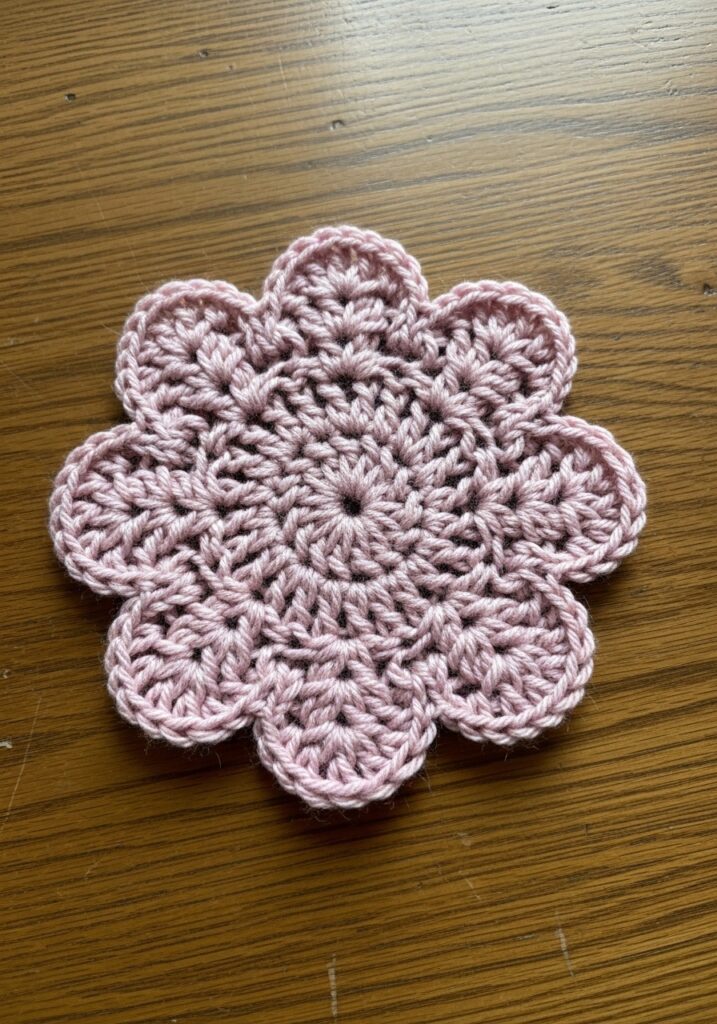 This little crocheted coaster is so pretty it almost feels like a shame to put a coffee mug on it, and yet somehow that is exactly what makes it such a perfect project. Made in a soft dusty rose pink cotton yarn with a really lovely smooth, slightly shiny finish that gives it a clean and polished look, the coaster is worked entirely in the round from a central starting point and builds outward through rows of double crochet clusters into a gorgeous flower shape. The outer edge forms eight plump rounded petal scallops that give the whole piece that really satisfying symmetrical flower silhouette, and the way each petal is filled with neatly packed stitches creates a beautifully dense and even texture throughout. The inner section fans out from the center in a starburst formation of stitches that transitions so smoothly into the petal border that the whole thing looks like one continuous flowing design rather than separate sections worked in stages.
