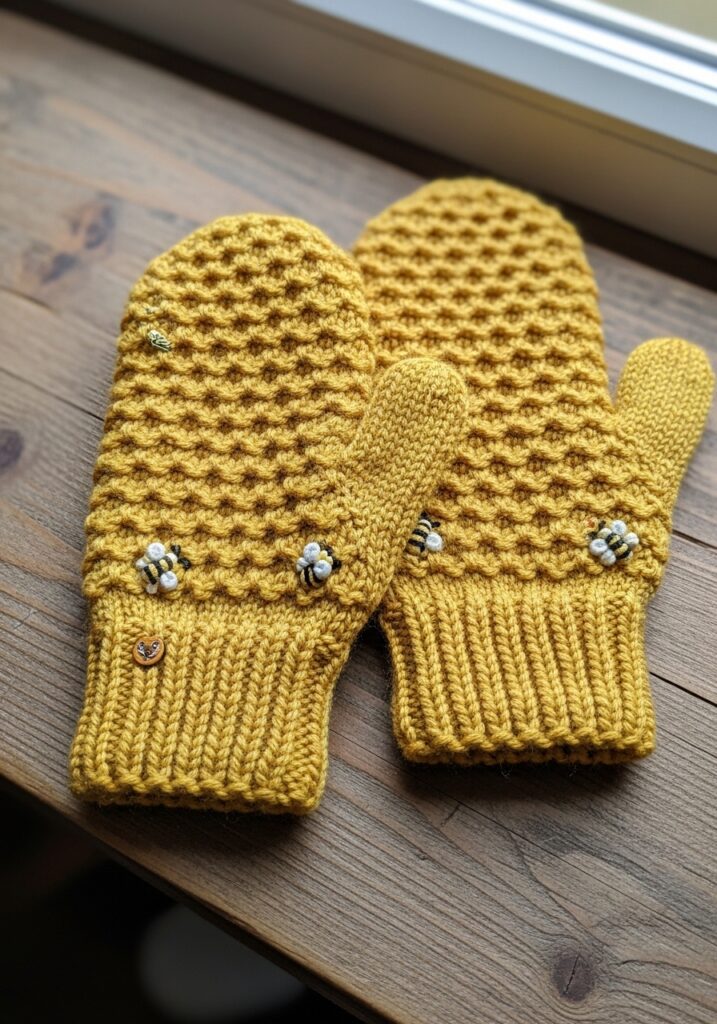 Honeycomb Stitch Mittens with Bee Embellishments