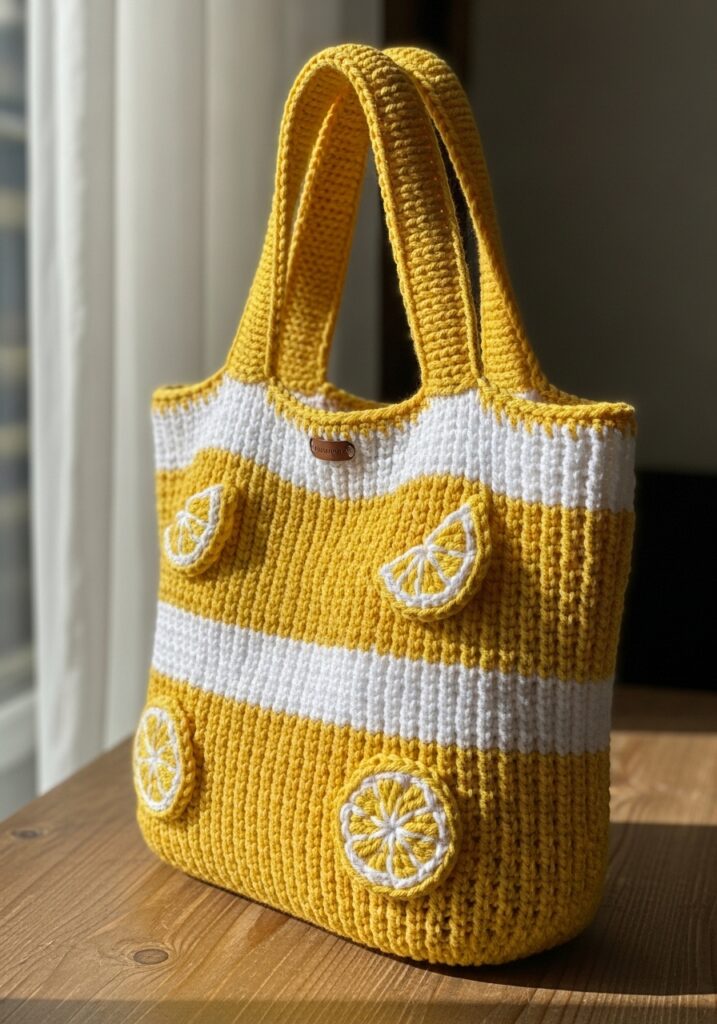 This sunny little tote bag is basically a whole mood in yarn form and I absolutely cannot stop staring at it. Worked in a cheerful golden yellow and crisp white cotton yarn, the bag features bold horizontal stripes across the body that give it that fresh, retro summer aesthetic. The stitch texture is dense and structured throughout, creating a really sturdy bag that clearly holds its shape beautifully. But the details that make this truly special are the three-dimensional lemon slice appliqués dotted across the front, each one carefully crafted with a round whole lemon slice at the bottom and two smaller wedge shapes above it, all worked in white with yellow detailing to mimic the segments of a real lemon. The two chunky handles are crocheted in the same golden yellow and look thick and practical enough to actually carry a decent amount of stuff around.