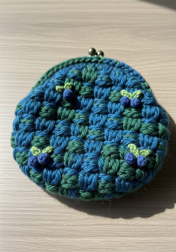 What gets me about this project is how it takes a simple coin purse shape and turns it into something that feels genuinely artistic. The two-color textured stitch body is such a clever technique because the color alternation does most of the visual heavy lifting for you, and the blueberry bobbles are a fun little bonus step at the end that make the whole thing feel so intentional and whimsical. I love that the color palette feels a bit unexpected too because most fruit-themed crafts go bright and primary, and this moody jewel-toned version feels really fresh and grown-up. It would make the most beautiful handmade gift tucked inside a little pouch, and I guarantee nobody would believe you made it yourself.