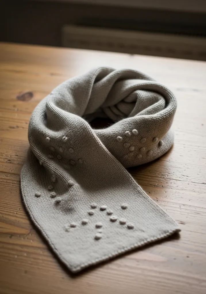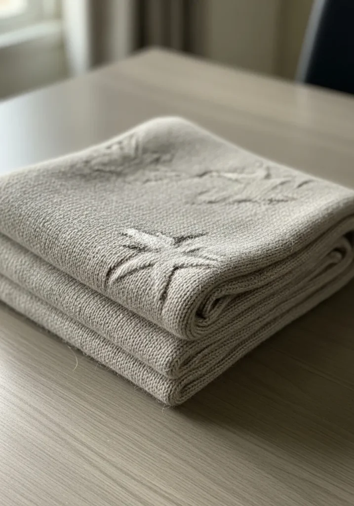 This modern knit scarf keeps things beautifully simple with its soft neutral beige tone and gentle stitched details that almost feel like quiet little starbursts. The fabric looks cozy but lightweight, with a smooth knit surface broken up by subtle raised textures and natural folds. It’s neatly folded on a clean surface, showing off the relaxed drape and slightly imperfect stitching that gives it that handmade, lived in charm.
