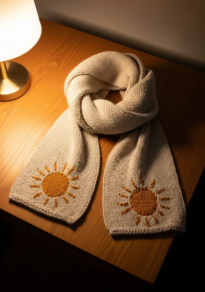 This modern knit scarf features a soft oatmeal beige base with cheerful sun motifs embroidered at each end. The knit texture looks cozy and slightly chunky, giving it a warm handmade feel. The golden yellow suns add a bright pop of color and gentle texture, standing out nicely against the neutral yarn. Everything about the design feels balanced and relaxed, with clean edges and an easy drape that makes it look effortless on and off the table.