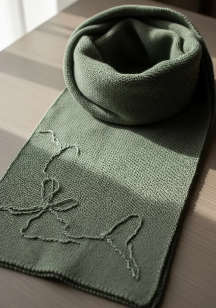 This modern knit scarf keeps things beautifully understated with its soft sage green yarn and fine stitched line details near one end. The knit texture looks smooth and even, giving it a clean and calm surface, while the delicate embroidery adds a quiet artistic touch. The loose flowing lines feel almost hand drawn, which gives the scarf a relaxed personality without distracting from its simple shape and cozy drape.