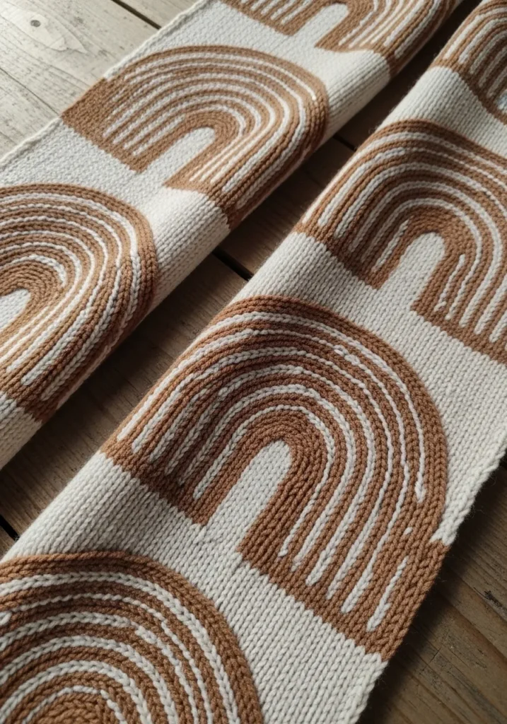 This modern knit scarf features bold repeating arch shapes in warm caramel brown layered over a soft cream base. The pattern feels graphic and playful while still staying cozy and wearable. The knit texture is smooth and even, with clean color changes that show off the curved lines beautifully. Everything about it feels thoughtfully made, from the tidy edges to the satisfying weight that gives it a lovely drape.