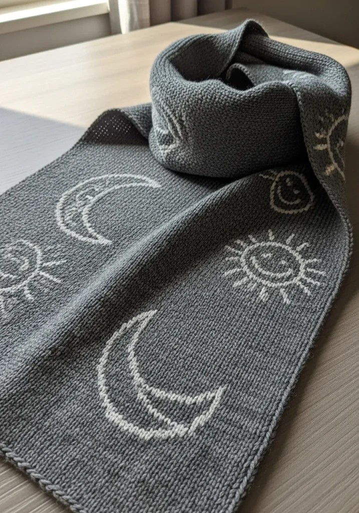 This modern knit scarf features a deep charcoal gray base decorated with soft white celestial symbols like crescent moons and simple sun shapes. The knit texture looks smooth and cozy, giving the scarf a nice weight and an easy drape. The motifs feel hand drawn and spaced out just enough to keep the design calm and balanced. Everything about it feels thoughtful and wearable, with clean edges and a relaxed finish that suits everyday outfits.