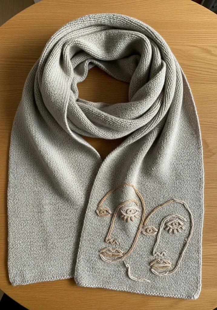 This modern knit scarf features a soft light gray base with minimalist face line embroidery stitched near one end. The knit texture looks smooth and cozy, giving it a relaxed drape that feels easy to wear. The embroidered faces use warm neutral thread tones that gently contrast against the fabric, creating an added artistic feel without overpowering the scarf. The overall design feels modern and expressive while still staying calm and wearable.