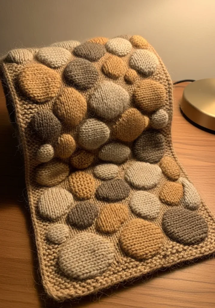 This modern knit scarf features a bold raised pebble texture made from soft yarn in warm neutral shades like sand, oatmeal, taupe, and light brown. Each rounded bump adds cozy dimension, giving the scarf a sculptural look while still feeling soft and wearable. The base knit is sturdy and smooth, letting the textured sections really stand out. The overall design feels earthy, tactile, and a little artsy without being overwhelming.