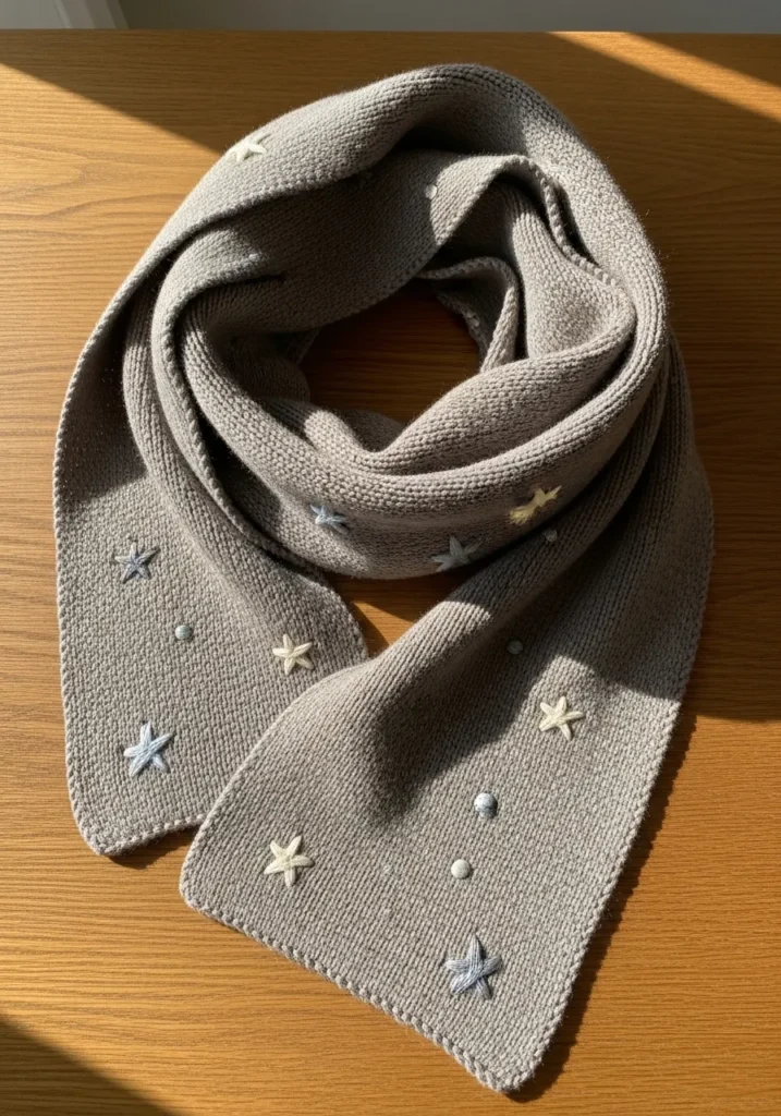 This modern knit scarf features a cozy taupe gray base with small embroidered stars and tiny dot details scattered near the ends. The knit texture looks smooth and even, giving it a clean and relaxed drape. Soft cream and pale blue stitching adds gentle contrast without overpowering the neutral yarn. The overall design feels calm and effortless, with just enough detail to catch the eye while staying easy to style.