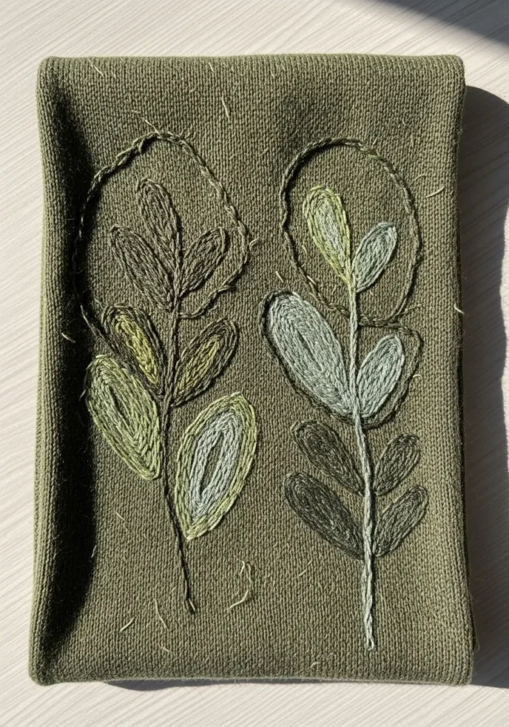 This modern knit scarf features a rich olive green base with soft botanical embroidery stitched near one end. The knit texture looks smooth and cozy, creating a sturdy canvas for the delicate leaf designs. The embroidery uses muted green tones that blend beautifully into the fabric, giving the leaves a hand drawn and organic look. Everything about it feels earthy and calm, with a relaxed finish that still looks thoughtfully made.